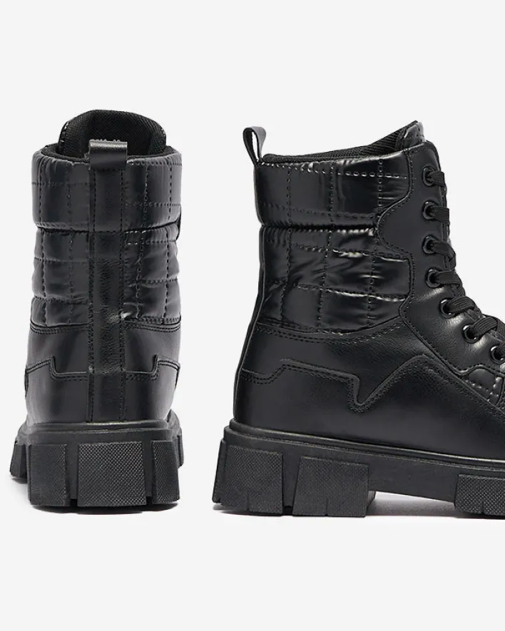 - Doskonałe damskie sznurowane botki a’la workery, cholewka wykonana jest z połączenia skóry ekologicznej oraz sztucznego materiału a’la cerata z pikowanym wykończeniem. Środek wyłożony tkaniną. CZARNE NIEOCIEPLANE BOTKI TRAPERY QERTERA
