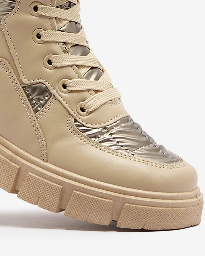 - Doskonałe damskie sznurowane botki a’la workery, cholewka wykonana jest z połączenia skóry ekologicznej oraz sztucznego materiału a’la cerata z pikowanym wykończeniem. Środek wyłożony tkaniną.