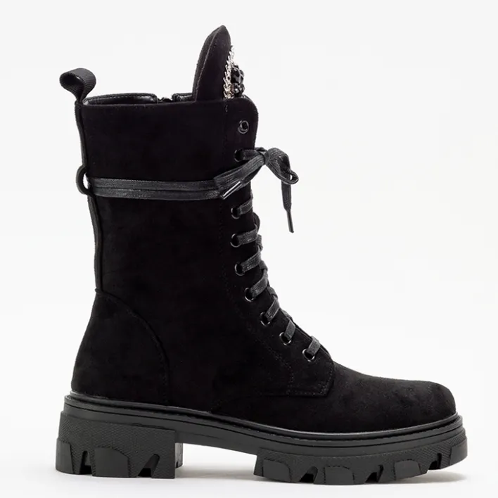 - Wysokie trapery damskie z eko-zamszu, sznurowane oraz zapinane na suwak. Dodatkowo ozdobne kamyczki na języku. Model na wyższej podeszwie, w środku tkanina. Idealny wybór na chłodniejszy czas!